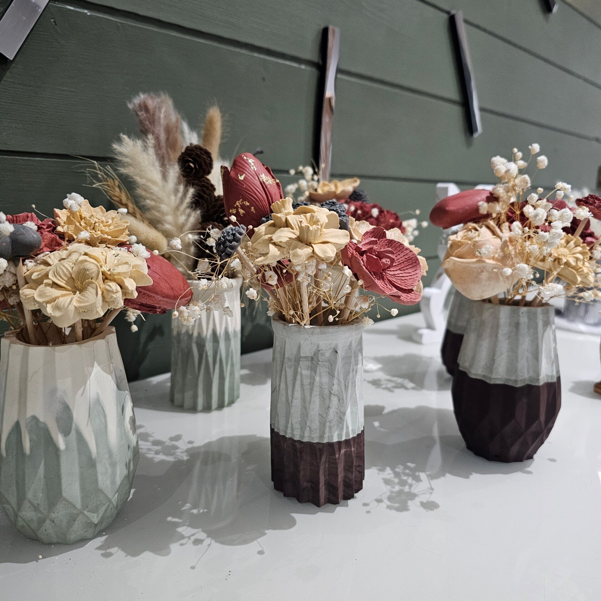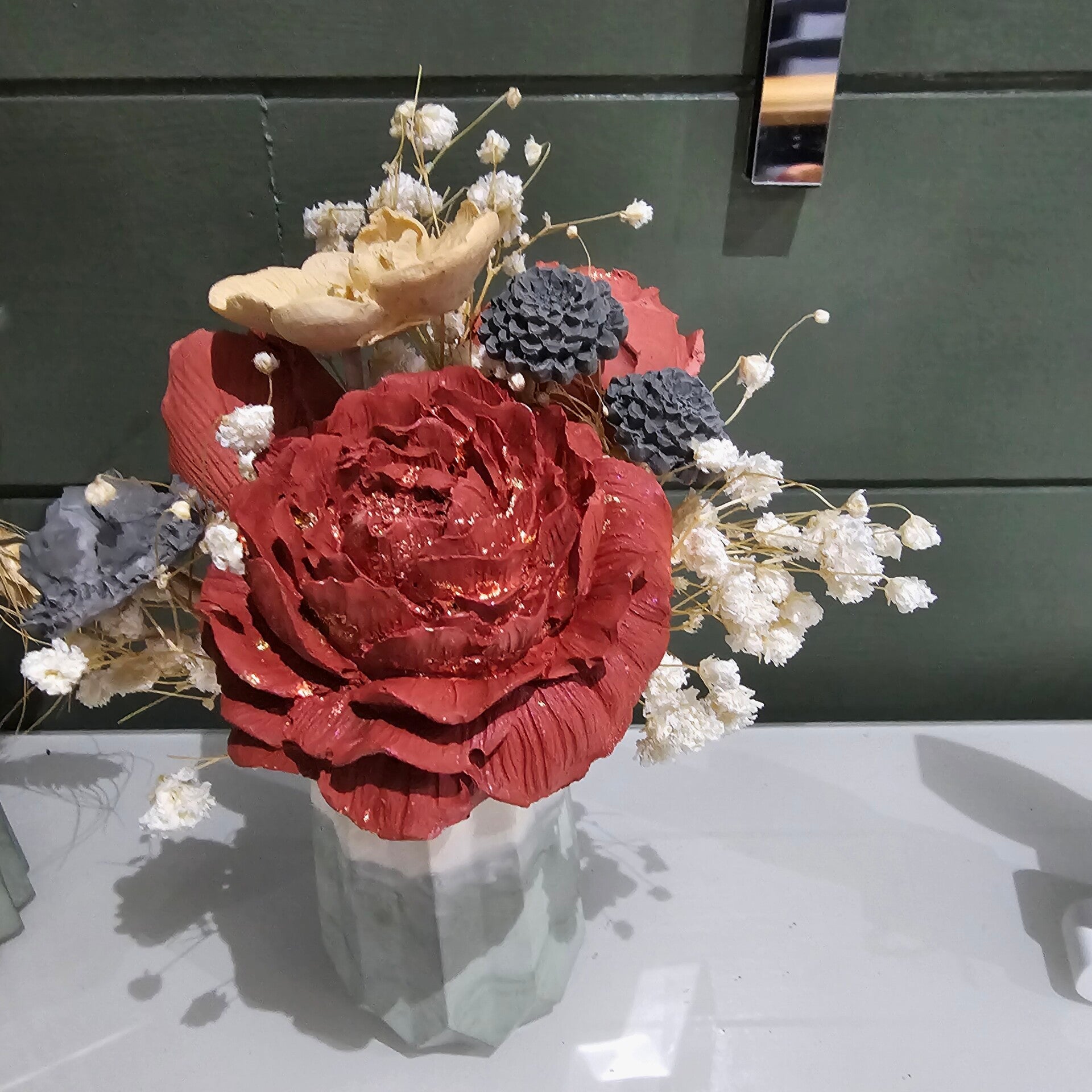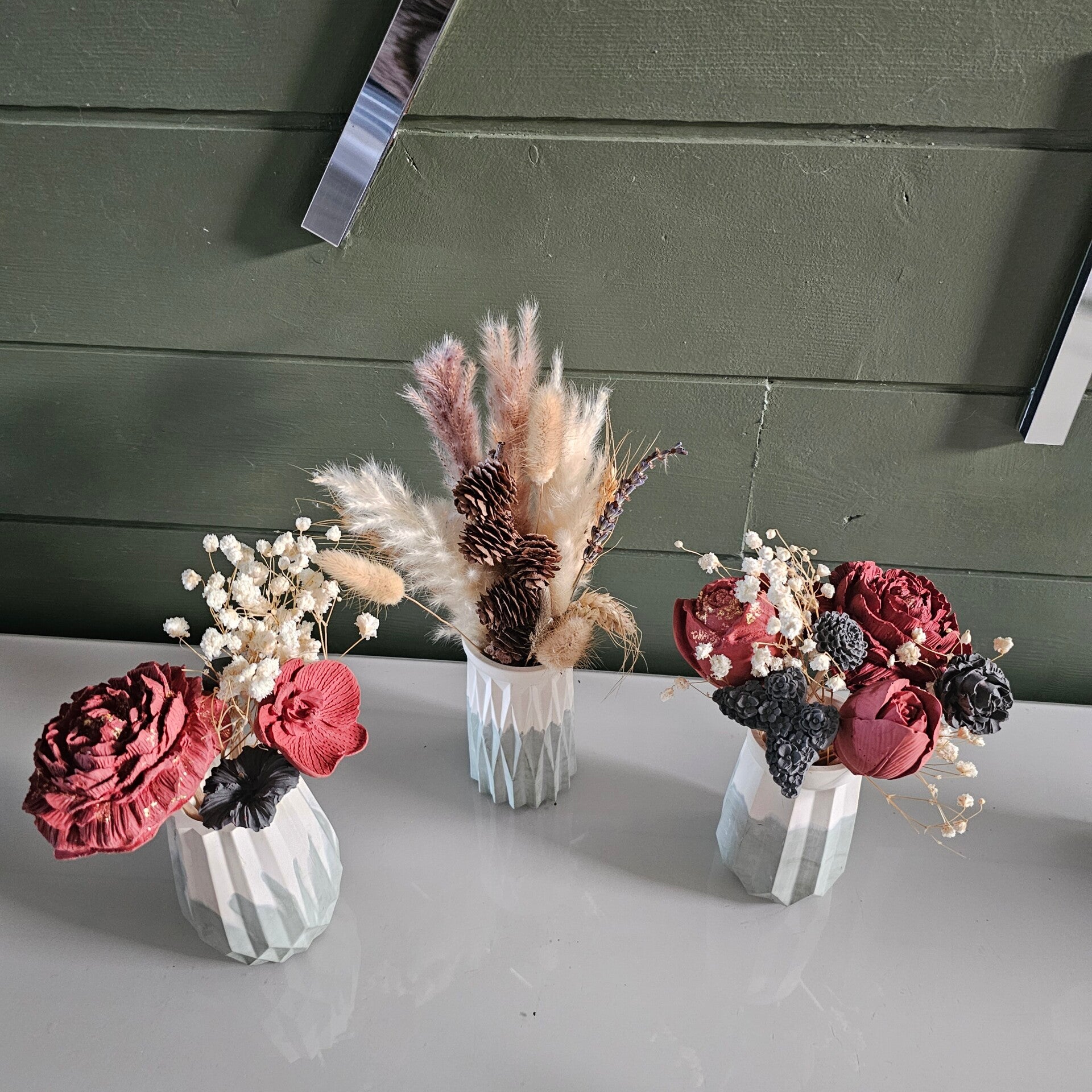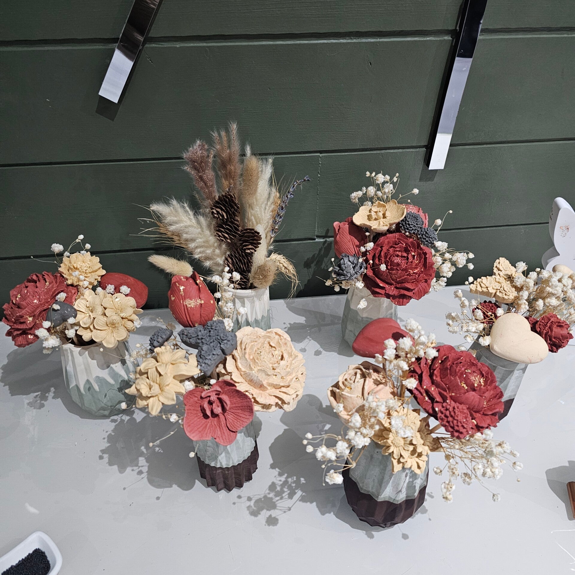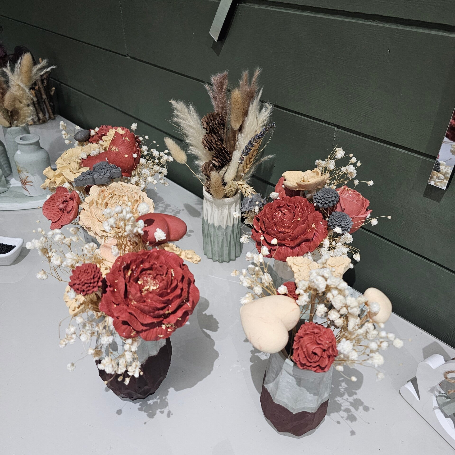 Bouquet éternel, couleurs au choix pour les fleurs et pots et variété de fleurs au choix me contacter par mail.(entre 6-8 fleurs et décorations)